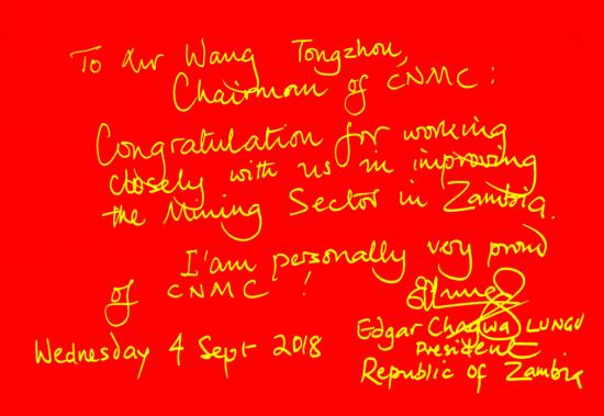 為表達(dá)對論壇成功舉行的祝賀,9月4日,倫古總統(tǒng)閣下親筆題寫致中國有色集團(tuán)董事長王彤宙的賀信,信中寫道:“祝賀中國有色集團(tuán)和贊比亞緊密合作,共同促進(jìn)贊比亞的礦業(yè)發(fā)展,我為中國有色集團(tuán)感到自豪”。