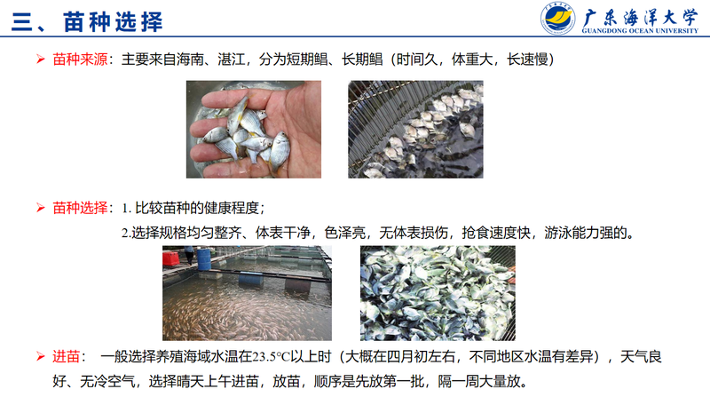 深水網(wǎng)箱養(yǎng)殖:高產(chǎn)核心模式,優(yōu)選避風(fēng)水深 10 米以上的近海區(qū)域。4 月水溫穩(wěn)定 23℃以上時投苗,初始苗種規(guī)格 3cm 左右,密度 100 尾 / 立方米,長至 7cm 后分箱,最終養(yǎng)成密度控制在 30 尾 / 立方米。餌料可選用攪碎的鮮雜魚或?qū)S门浜巷暳希?~8 月旺季日投餌量達(dá)魚體重 20% 以上,每日投喂 2~5 次,日常需落實 “五勤一細(xì)”,定期清洗網(wǎng)箱。 苗種與繁育:源頭把控養(yǎng)殖成功關(guān)鍵 苗種優(yōu)先選用海南、湛江優(yōu)質(zhì)產(chǎn)區(qū)的健康魚苗,需滿足規(guī)格均勻、色澤鮮亮、無損傷、搶食能力強(qiáng)等標(biāo)準(zhǔn),選擇水溫 23.5℃以上的晴天上午分批次投放。人工繁育方面,選用 3~4 齡健康親魚,繁殖前 3 個月強(qiáng)化培育,投喂新鮮小雜魚并添加復(fù)合維生素;采用 HCG 與 LRH-A 系列激素催產(chǎn),受精卵在 19~30℃水溫、27~34 鹽度條件下孵化,密度控制在 35~50 萬粒 / 立方米,確保水質(zhì)清潔以提升孵化率。