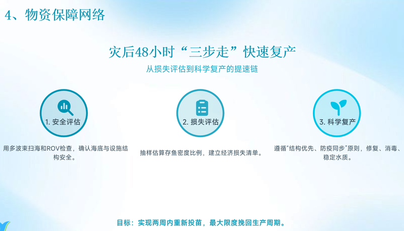 災(zāi)后復(fù)產(chǎn)需科學(xué)施策。實(shí)戰(zhàn)證明,通過(guò) "安全評(píng)估 — 損失評(píng)估 — 科學(xué)復(fù)產(chǎn)" 三步走,配合電力、交通等生命線 72 小時(shí)搶通機(jī)制,可實(shí)現(xiàn)兩周內(nèi)重新投苗、一個(gè)月內(nèi)產(chǎn)能基本恢復(fù)。政府與社會(huì)協(xié)同發(fā)力,構(gòu)建物資保障三級(jí)體系,同步推進(jìn)健康防疫,實(shí)現(xiàn)了人員零傷亡、災(zāi)后無(wú)大疫的成效。