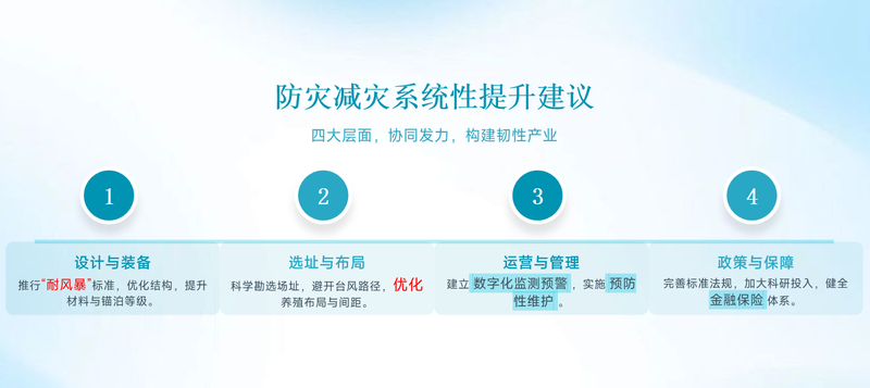 防災(zāi)減災(zāi)更要未雨綢繆。建議從四方面系統(tǒng)提升:推行 "耐風(fēng)暴" 標(biāo)準(zhǔn),優(yōu)化網(wǎng)箱結(jié)構(gòu)與錨泊設(shè)計(jì);科學(xué)選址布局,避開(kāi)臺(tái)風(fēng)高頻路徑;建立數(shù)字化監(jiān)測(cè)與預(yù)防性維護(hù)機(jī)制;完善政策法規(guī)與金融保險(xiǎn)體系。通過(guò)技術(shù)升級(jí)強(qiáng)化 "物的韌性",數(shù)據(jù)驅(qū)動(dòng)優(yōu)化 "人的決策",制度護(hù)航健全 "策的保障",方能實(shí)現(xiàn)從被動(dòng)應(yīng)對(duì)到主動(dòng)防控的轉(zhuǎn)變。